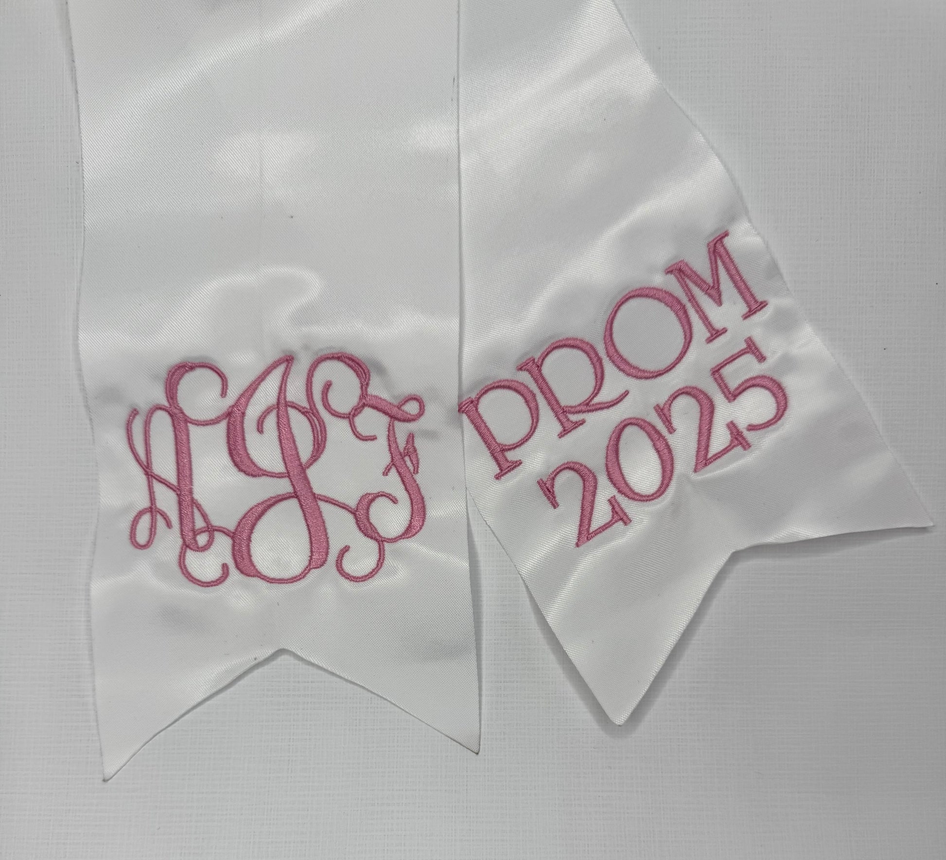 "Add a personalized touch to your bouquet with our Prom Sash! This sash can be tied around your flowers and features your monogram, making it a unique and special accessory for your big night.